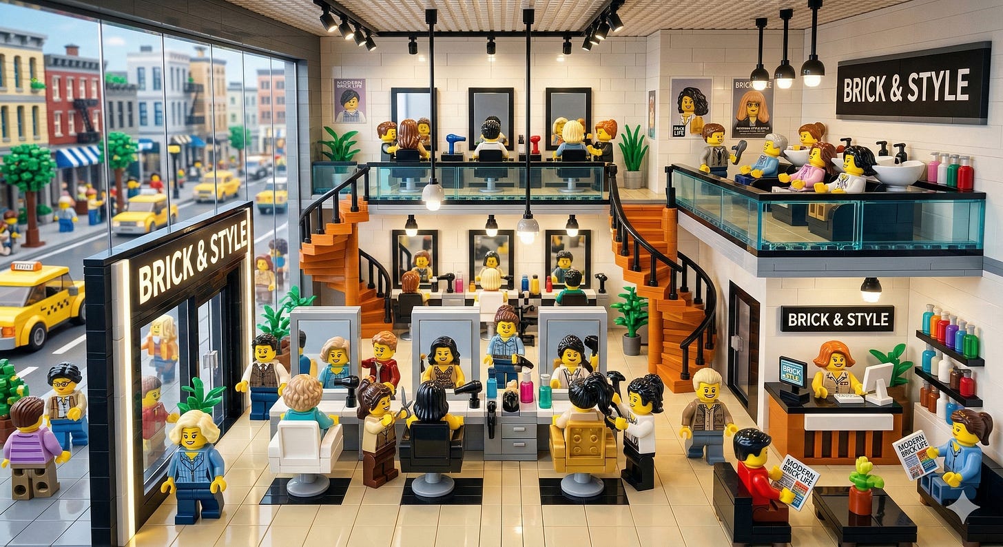 My Gemini prompt: “Please create a photo-like image of a Lego inspired modern, busy, upscale, full-service hair salon.”