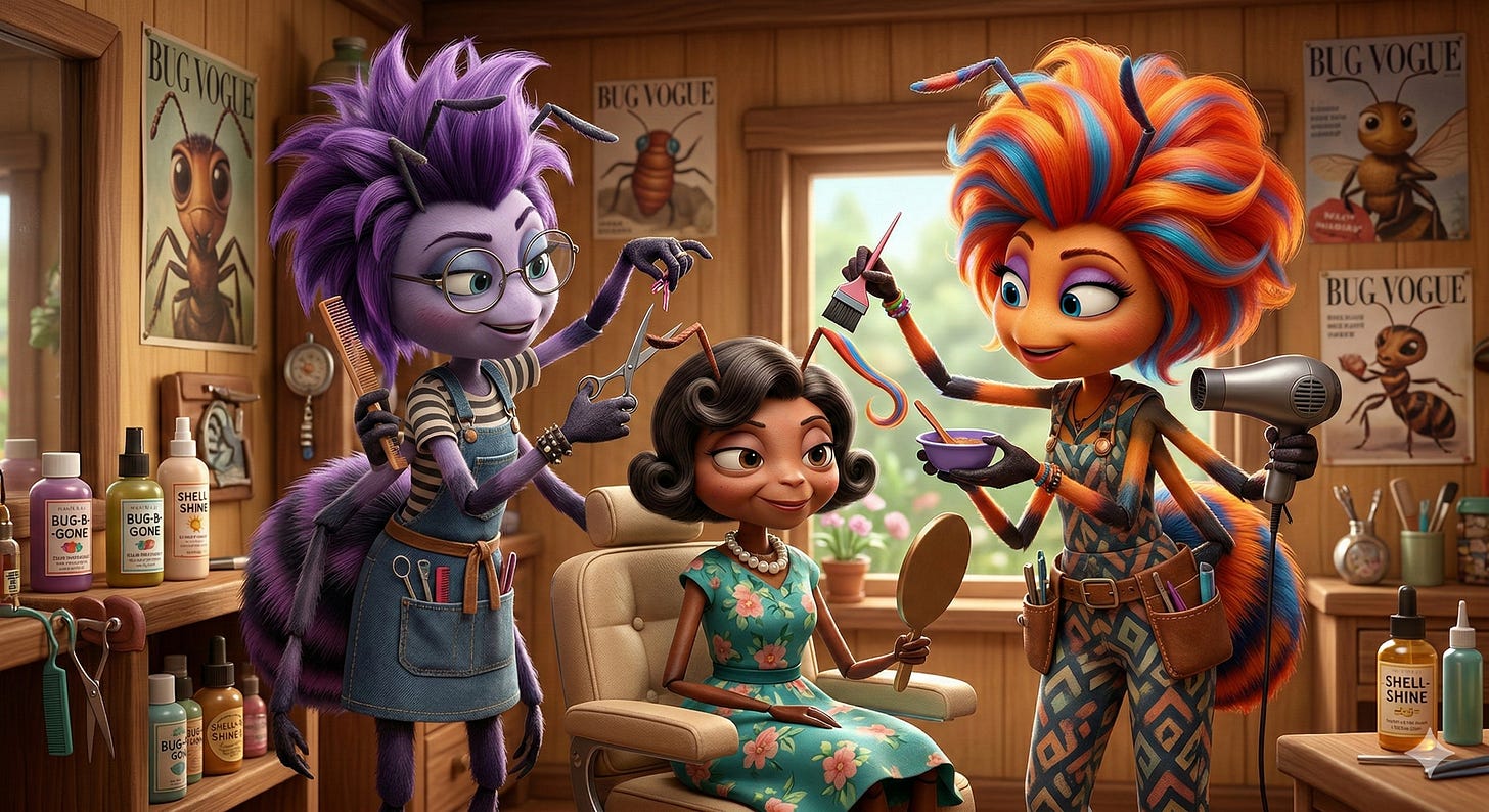 My Gemini Prompt: “Please create a photo-like image of two Pixar-style spiders as female hairdressers working together on a client, using lots of hands to cut, color, and style. The client is an ant dressed as a woman.” Note: look at how Gemini chose to do the posters and label the bottles!