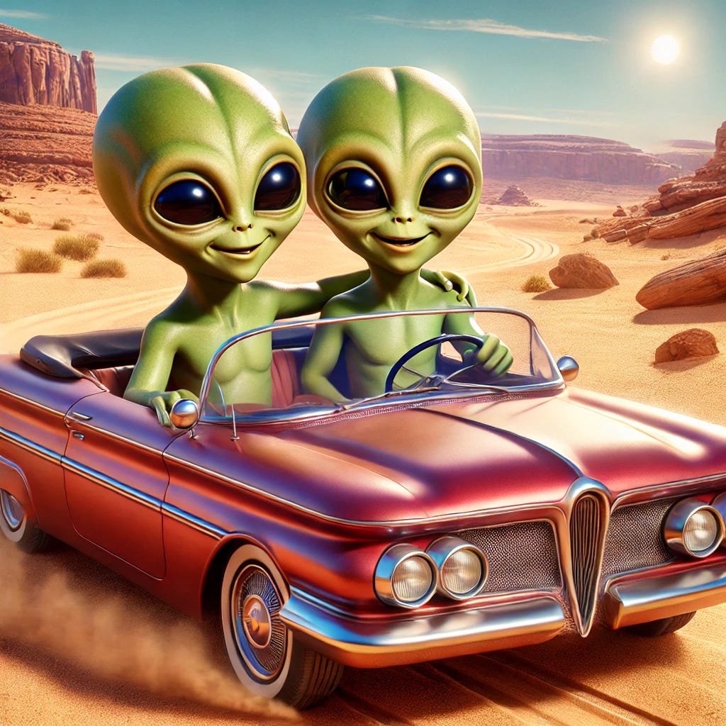 Based on my ChatGPT Prompt: “Please create a photo-like image of two friendly looking Martians who are driving together in a convertible in the dessert “