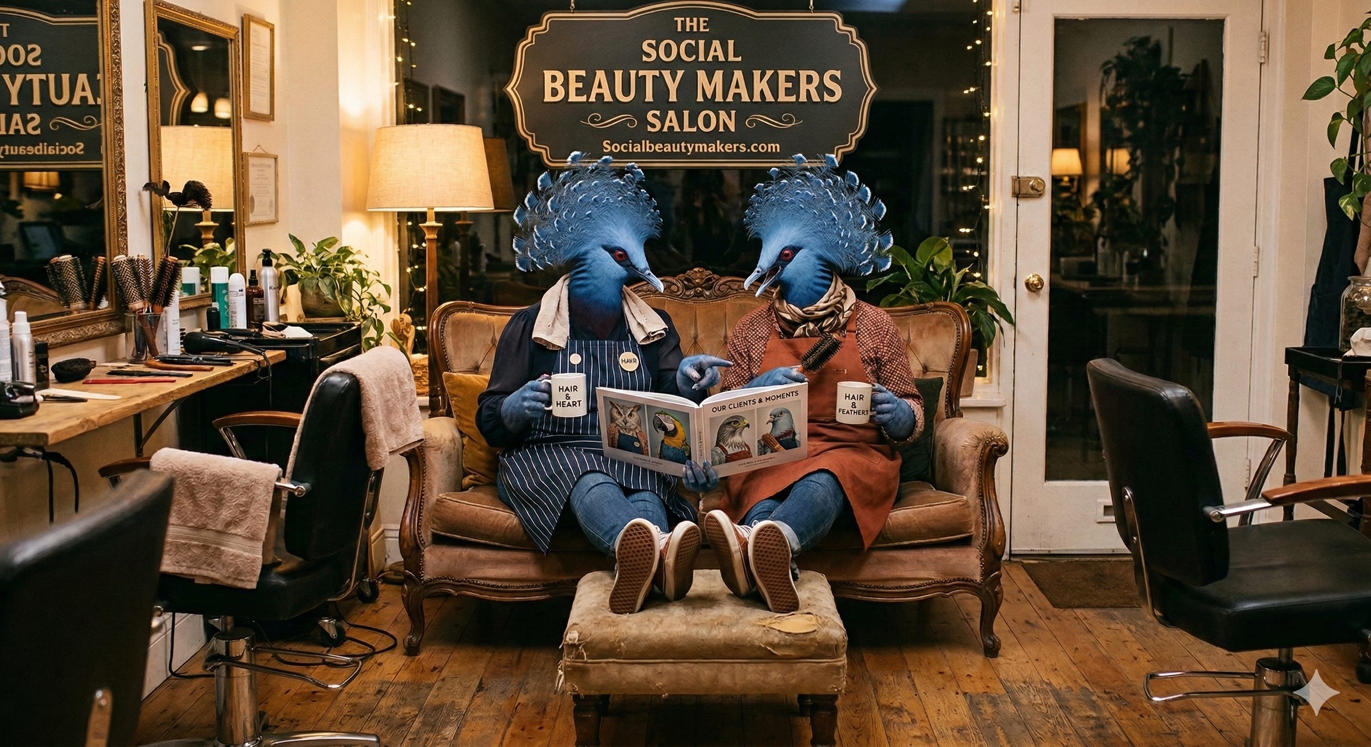 My Gemini Prompt: “Two Victoria Crowned Pigeons dressed as human hairdressers in their salon at the end of a hard day, enjoying some downtime together.” Note: The amount of detail with such a short prompt is amazing. Clearly, by the looks of the sign, Gemini knows me. 🤓