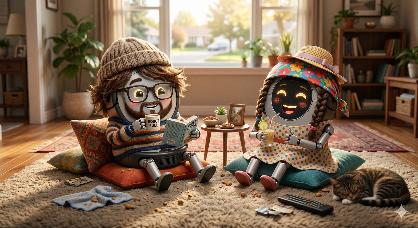 Gemini Image Prompt: “Please create a photo like image of two roomba-like vacuum cleaners as people like, relaxing together while their owners are away and they take a break from never-ending cleaning“