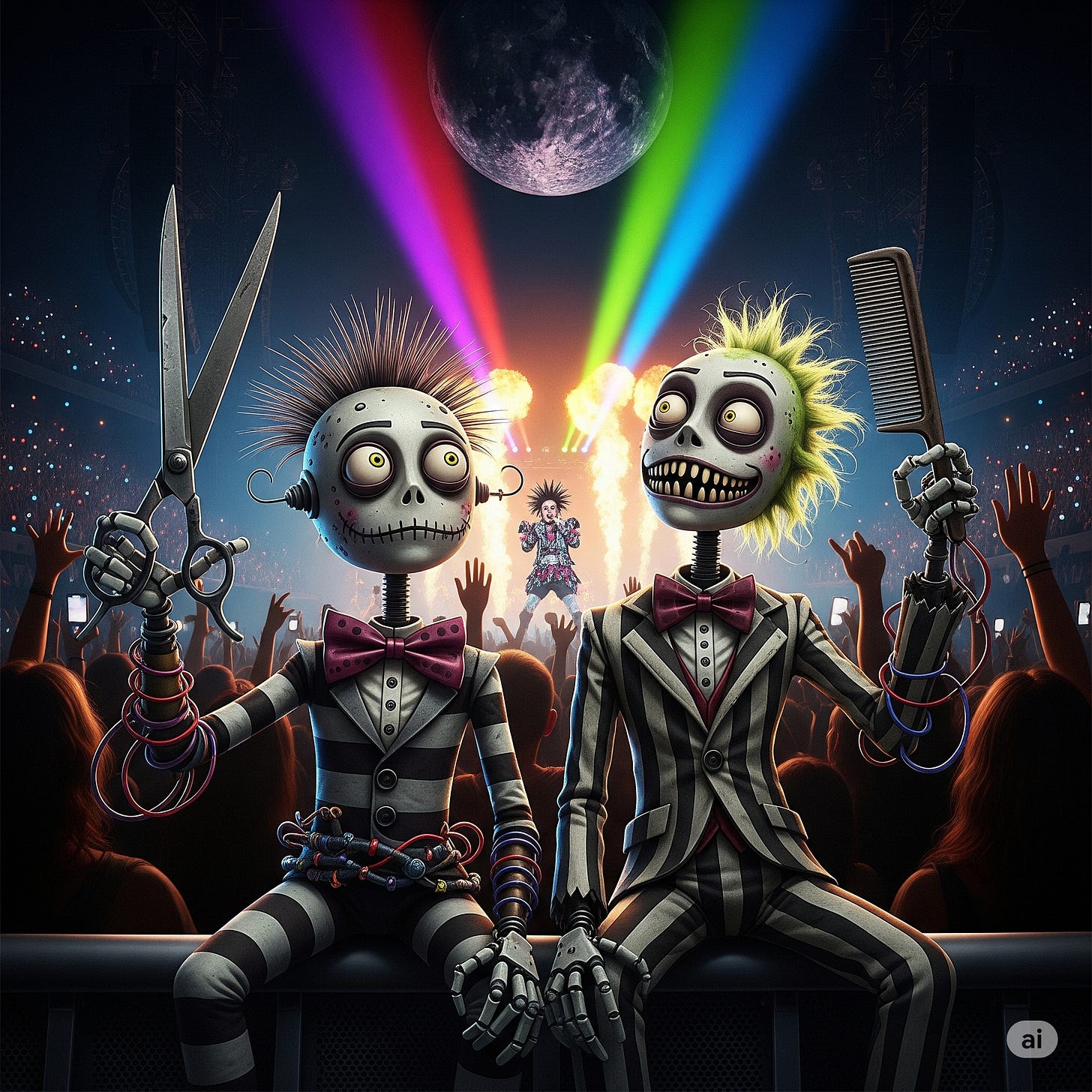 Gemini Prompt: Please create a photo like image of two robot hairdressers inspired by the director Tim Burton's style of art. The robots are sitting at a wildly energetic pop concert. NOTE from Gordon: ChatPGPT correctly would not create this image given my Tim Burton reference. i’m surprised Gemini did so am sharing as an FYI. Importantly, this is not likely ‘kosher’ from legal point of view.