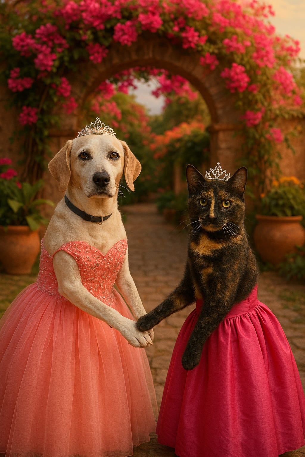 ChatGPT Image Prompt: We are soon headed to Mexico to winter (and WORK!)-and getting an early start. In honor of the move, please give me an image of Cody and Olivia holding hands in beautiful courtyard in Mexico, dressed up for their Quinceanera Dresses (think sweet 16!).